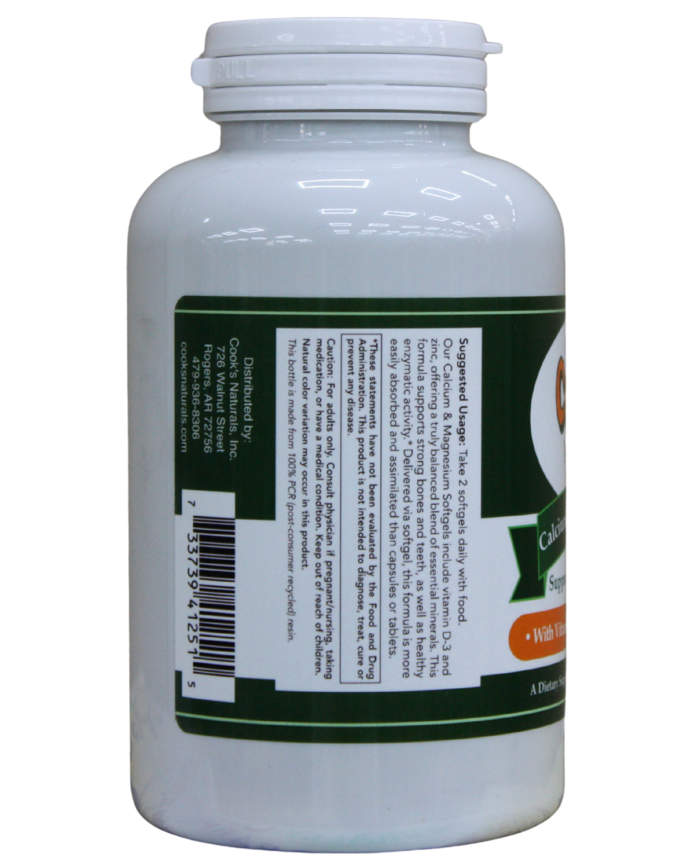 Cook’s Calcium & Magnesium Softgels include Vitamin D-3 and Zinc, offering a truly balanced blend of essential minerals. This formula supports strong bones and teeth, as well as healthy enzymatic activity.* Delivered via softgel, this formula is more easily absorbed and assimilated than capsules or tablets.